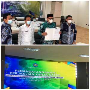 Obsesinews.com, Tanah Bumbu – Pemerintah Kabupaten Tanah Bumbu ikuti Penandatanganan Perjanjian Kerja Sama (PKS) Optimalisasi Pemungutan Pajak Pusat dan Pajak Daerah antara DJP, DJPK, dan Pemda Tahap III Secara Virtual di Digital Live Room Kantor Bupati, Rabu (21/04/2021).